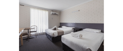 Each of the well-appointed rooms offer air-conditioning and heating, comfortable bedding, flat screen TV, FREE WIFI, Kettle, Toaster and Small Fridge, as well as ample free onsite parking, a shaded lawn area with picnic benches, and a free gas BBQ for use. Our onsite guest laundry is low cost to use and includes ironing facilities, a clothesline and a free to use dryer. Guests can enjoy complimentary use of our outdoor pool & games/arcade room at our sister holiday park just 3 minutes away.
